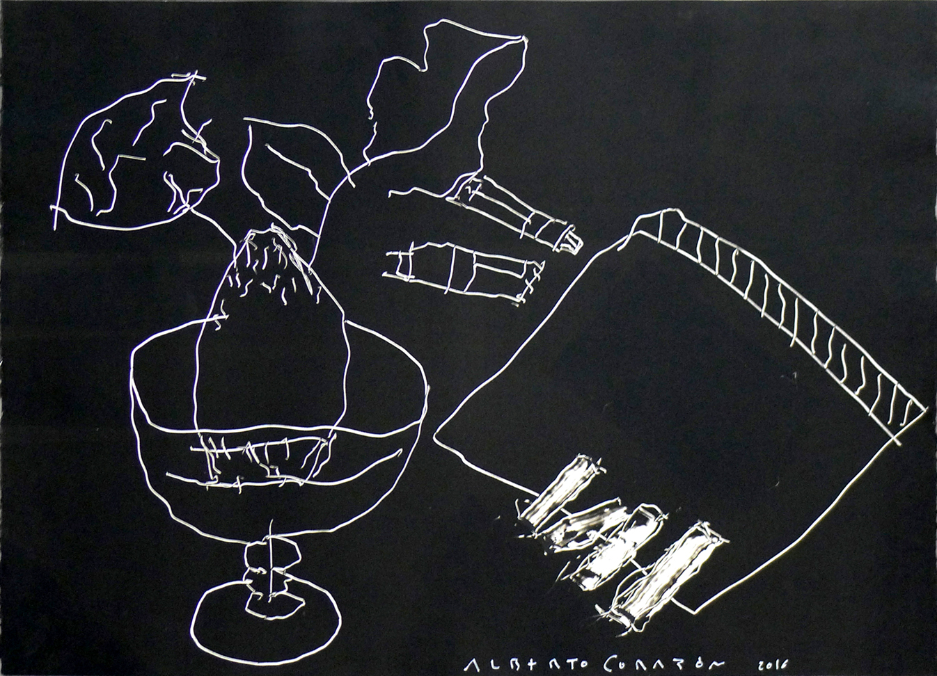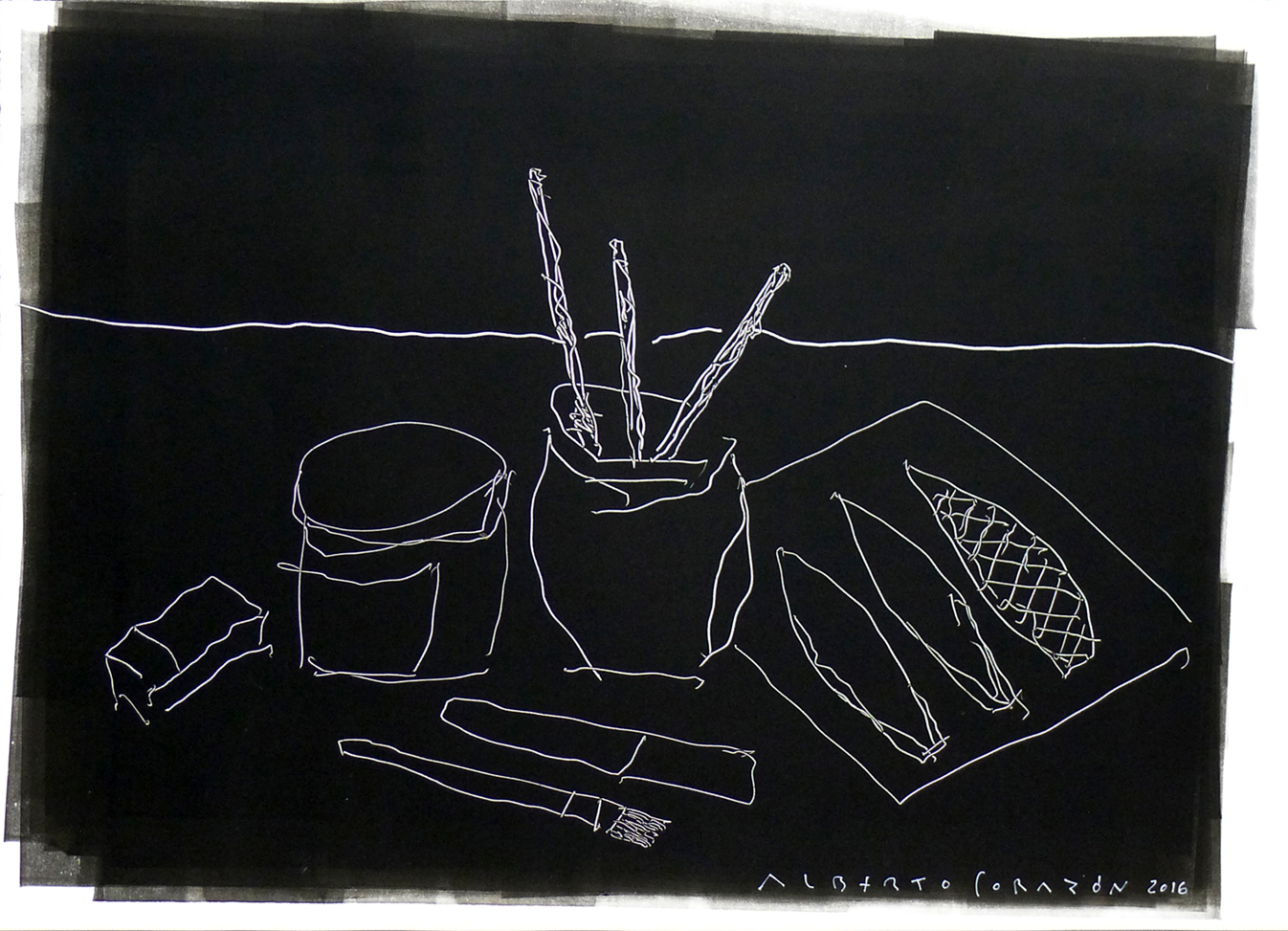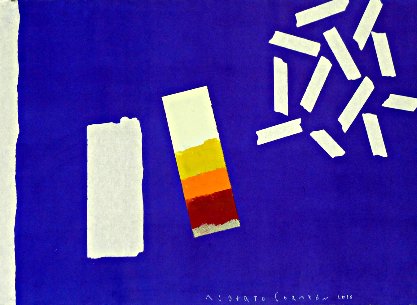 Alberto Corazón presenta en ‘Elegía de otoño’ una serie de obras realizadas expresamente en colaboración con Ogami Press. Algunas de las temáticas ampliamente desarrolladas por el artista –la mesa de trabajo, los útiles del artista, el oficio del escritor, la contemplación del paisaje, la naturaleza poetizada- se reúnen en el libro de artista ‘Elegía de otoño’ que se despliega a su vez en una serie de monotipos en los que Alberto profundiza en el discurso de color, trazo y escritura que le caracteriza.