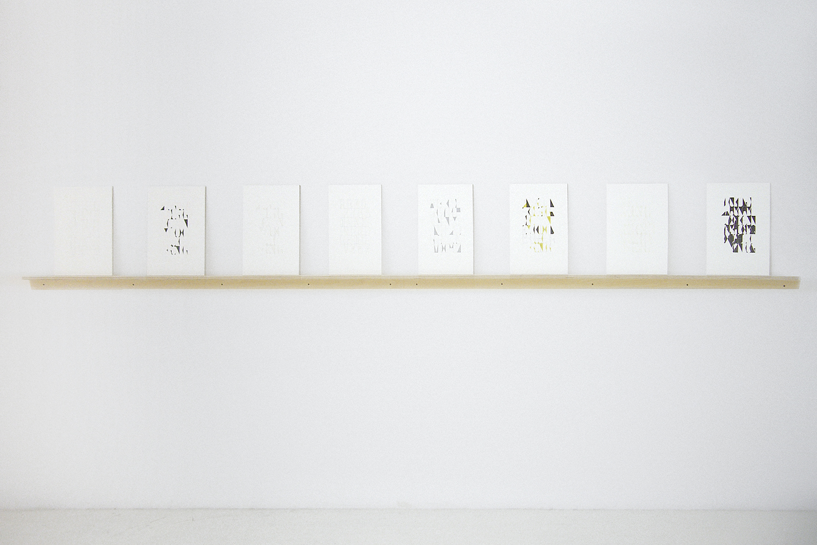 La obra barthesiana se ha convertido con el tiempo en una excusa para Javier Pividal a la hora de profundizar en la idea de que, más allá de ‘dejar hablar al cuerpo’, hay que ‘escribirlo’. En este sentido, surge en 2010 el proyecto ‘Écrire en blanc’ para el que desarrolla una tipografía sustractiva en tanto que oposición al esquema tradicional de negro sobre blanco. Esta escritura neutra y singular funciona como un iceberg que se transforma en imagen de la misma manera que el cuerpo se convierte en palabra. "De alguna manera son las palabras las que forman el motivo principal de las obras agrupadas bajo el proyecto Écrire en blanc y, sin embargo, puede que en este caso poco importen, o por lo menos no en la manera en que habitualmente nos servimos de ellas. Son palabras apropiadas y reinterpretadas, palabras que componen locuciones y sintagmas –palabras como citas–. Expresiones repetidas, sacadas de un contexto que remite a lugares alguna vez habitados por emociones y sentimientos, pero por un cuerpo que en realidad ya no está presente. Y es en ese vacío, o mejor, en la repetición de ese vacío, donde las palabras pierden su sentido, quizás porque lo que realmente nos cuentan no se puede encontrar –o no sólo– en su contenido." R. G. G.