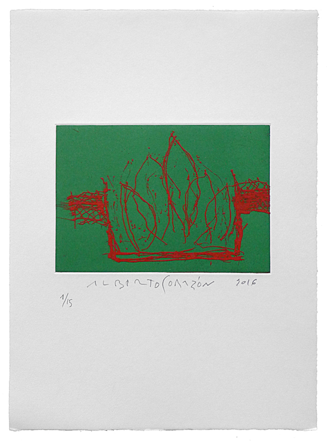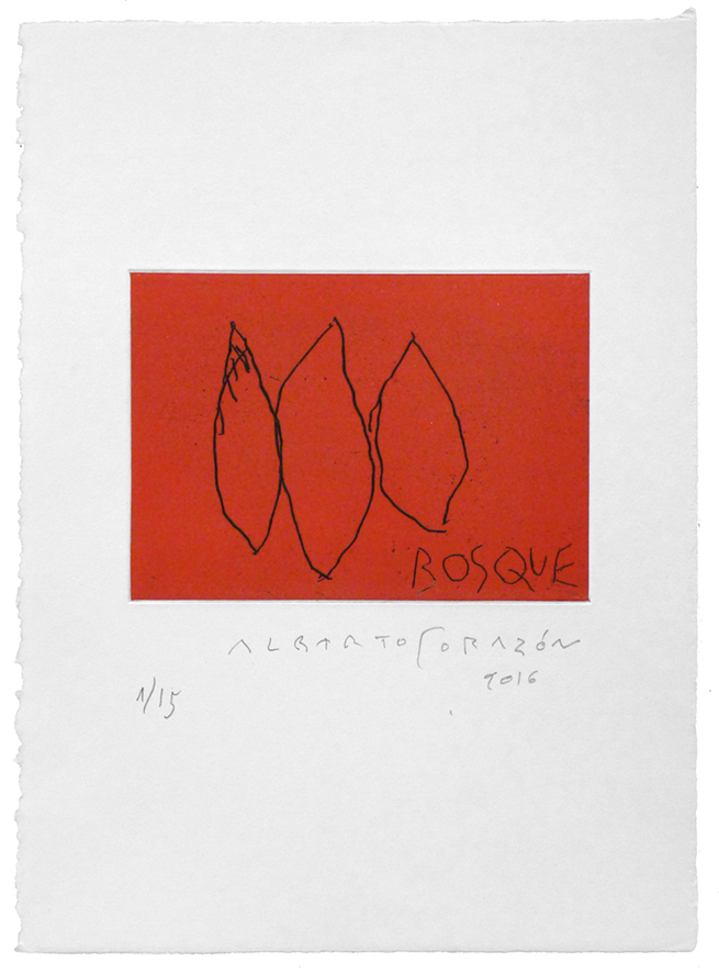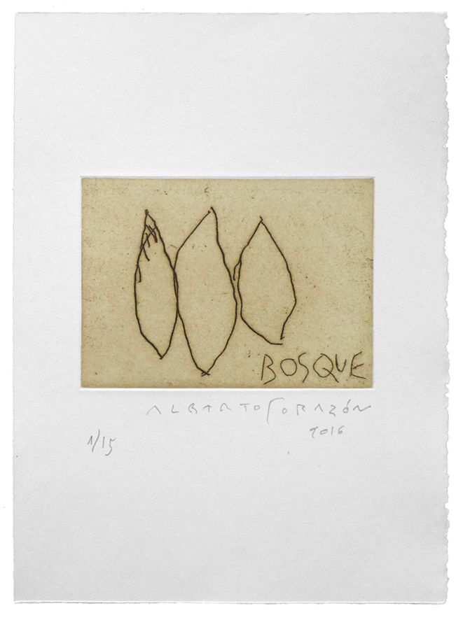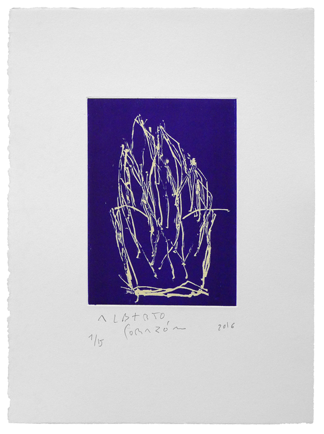 En 2015, Ogami Press le regala a Alberto Corazón un set de materiales para que el artista se sumerja en la técnica del aguafuerte aplicando sus particular universo gráfico directamente sobre la plancha de cobre. El resultado de las incisiones y trazos que realiza sobre el cobre, una vez que el ácido ha profundizado la mordida, constituye la serie de grabados 'Oscuro canto'.