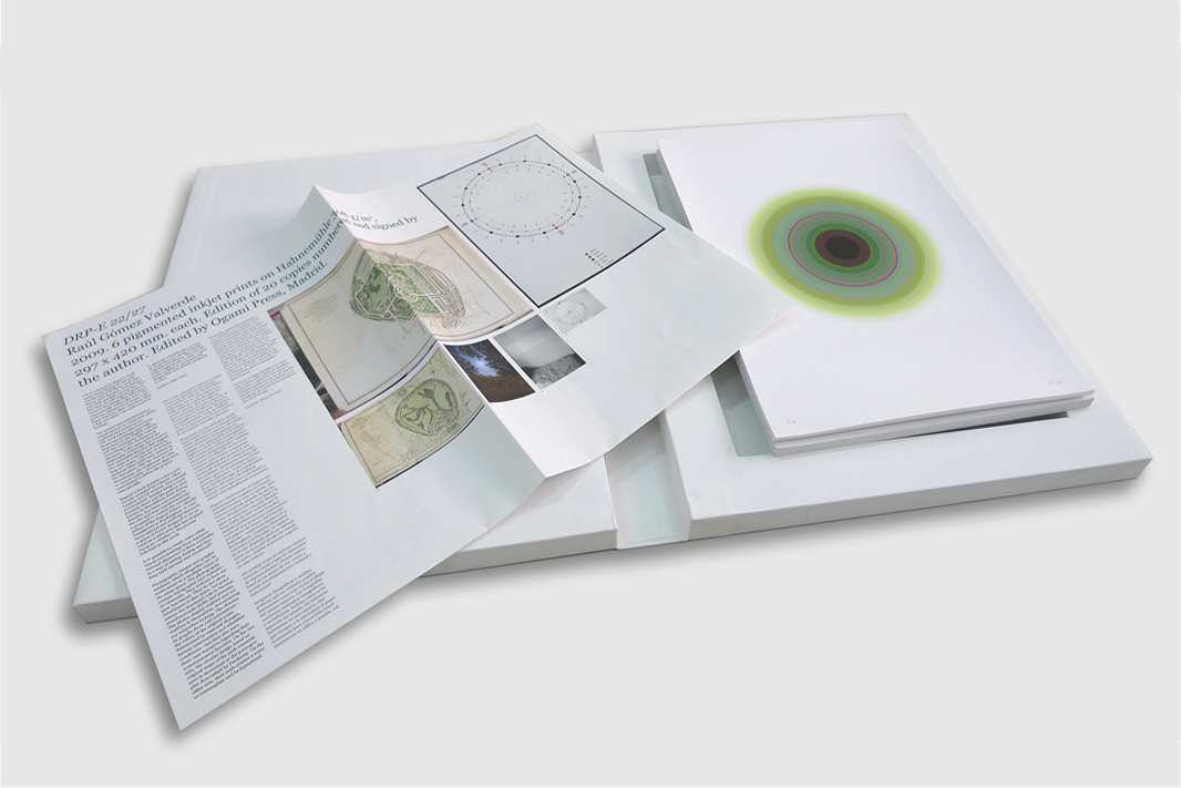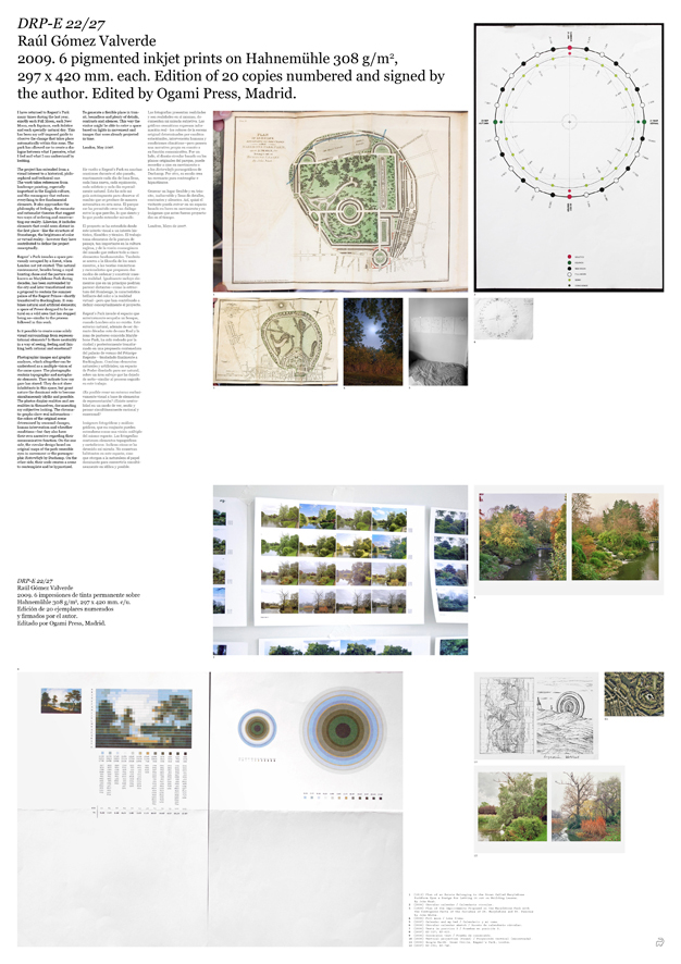 ¿Es posible crear un entorno puramente visual a base de elementos de representación contrapuestos? ¿Existe neutralidad en un modo de ver, sentir y pensar paralelamente racional y emocional? El proyecto DRP-E 22/27 extiende desde este interés visual hacia un interés histórico, filosófico y técnico. El proyecto toma elementos de la pintura de paisaje, tan importante en la cultura inglesa, y de la visión cosmogónica del mundo que reduce todo a cinco elementos fundamentales. También se acerca a la filosofía de los sentimientos, a las teorías románticas y racionalistas que proponen dos modos de ordenar y construir nuestra realidad. Igualmente incluye elementos que en un principio podrían parecer distantes –como la estructura de Stonhenge, la característica brillante del color o la realidad virtual- pero que han contribuido a definir conceptualmente el proyecto. El trabajo está compuesto por fotografías analógicas, fotografías digitales y análisis gráficos, que en conjunto se pueden entender como una visión múltiple del mismo espacio. Las imágenes fotográficas contienen elementos topográficos y metafóricos. Indican como se ha detenido mi mirada. No muestran habitantes de este espacio, si no que otorgan a la naturaleza el papel dominante para poder convertirse en algo simultáneamente idílico y posible. Las fotografías presentan realidades y son realidades en sí mismas. Documentan una mirada subjetiva. Las gráficas, circulares y animadas, expresan información real –los colores de la escena original determinados por cambios estaciónales, intervención humana y condiciones climáticas- pero poseen una narrativa propia en cuanto a su función comunicativa. Por un lado, el diseño circular basado en los planos originales del parque, puede recordar a ojos en movimiento y a los rotoreliefs pornográficos de Duchamp. Por otro, su escala crea un escenario para contemplar e hipnotizarse. Se genera así un espacio flexible y en tránsito, inabarcable y lleno de detalles, contrastes y silencios.
