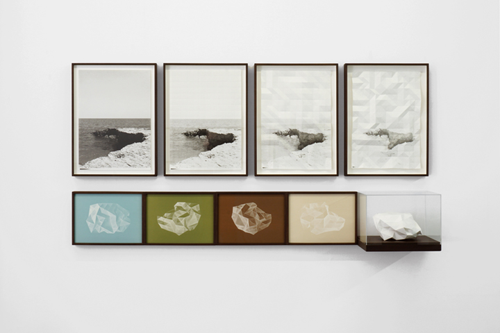 Inspirada en el legado del virtuoso orfebre manierista Wentzel Jamnitzer, la obra Imagine Corpore I de Almudena Lobera presenta un políptico en el que la imagen de un paisaje se desvanece a medida que se repliega, toma volumen, se abstrae y se transforma en cuatro elementos, retomando la gama cromática original del paisaje. Un trabajo que habla del proceso de captura, percepción, interpretación y representación de lo que vemos, en el que confluyen lo sensorial con lo tangible, lo calculado con lo aleatorio, la deconstrucción con la construcción y la imprecisión con la entelequia.