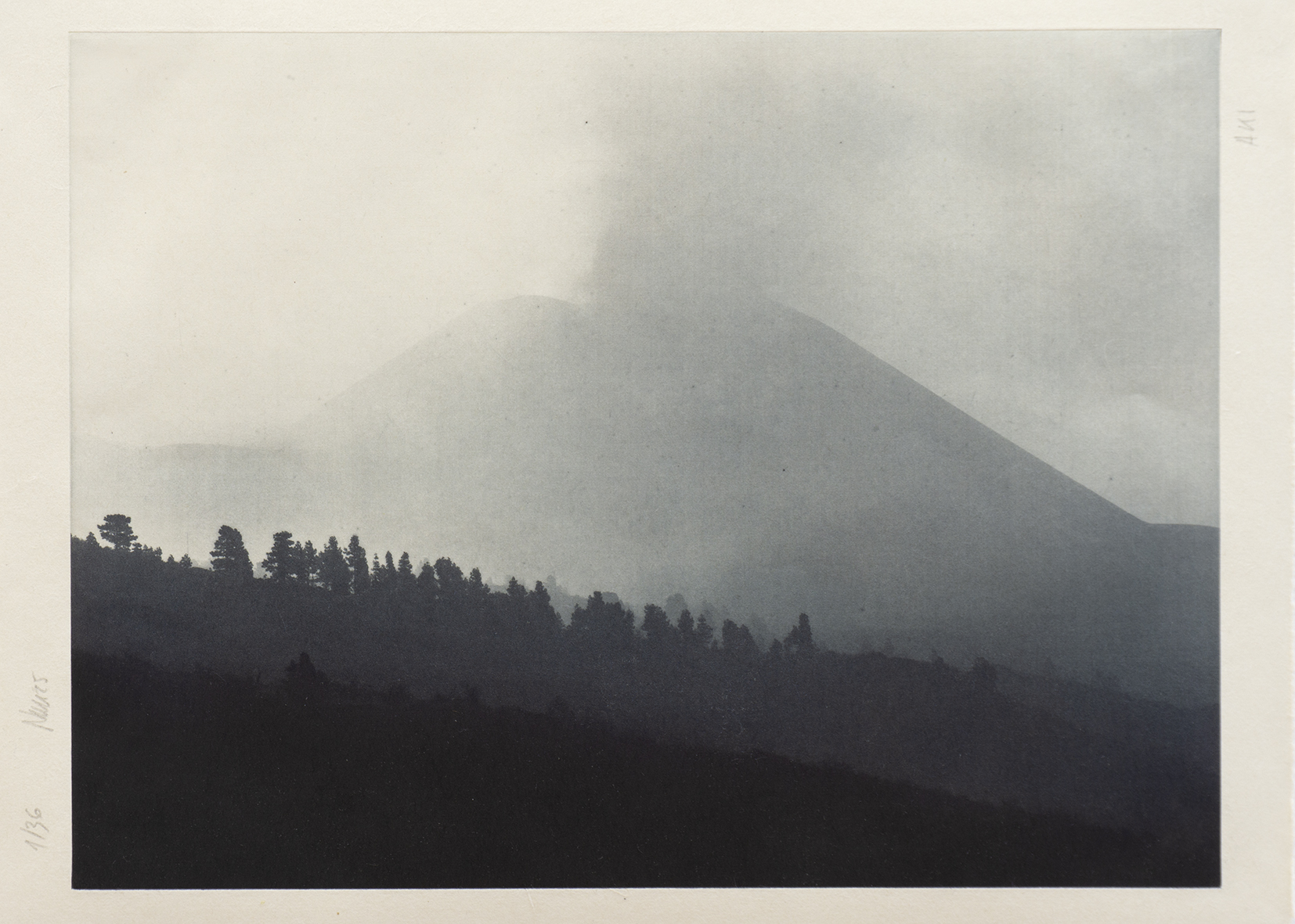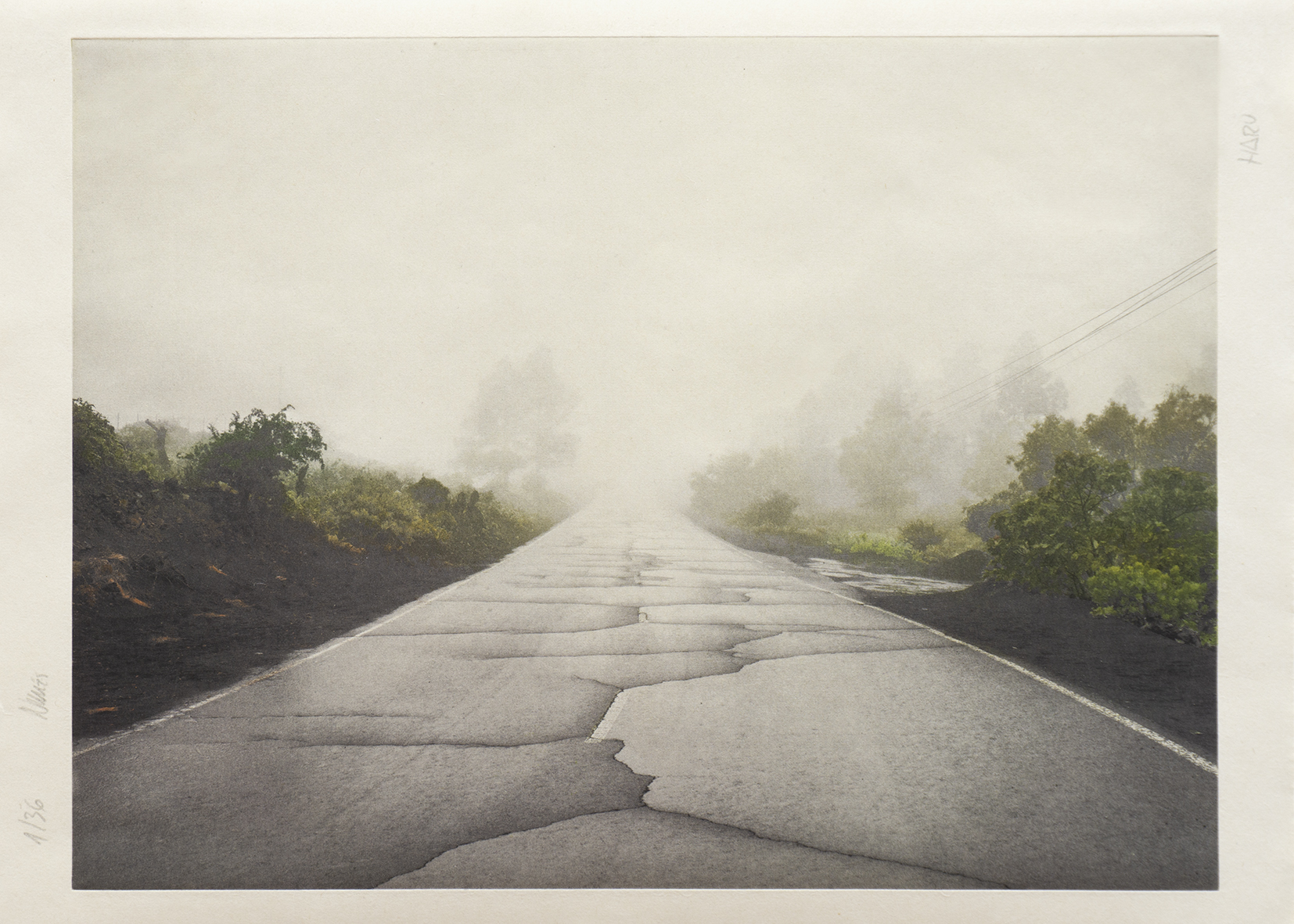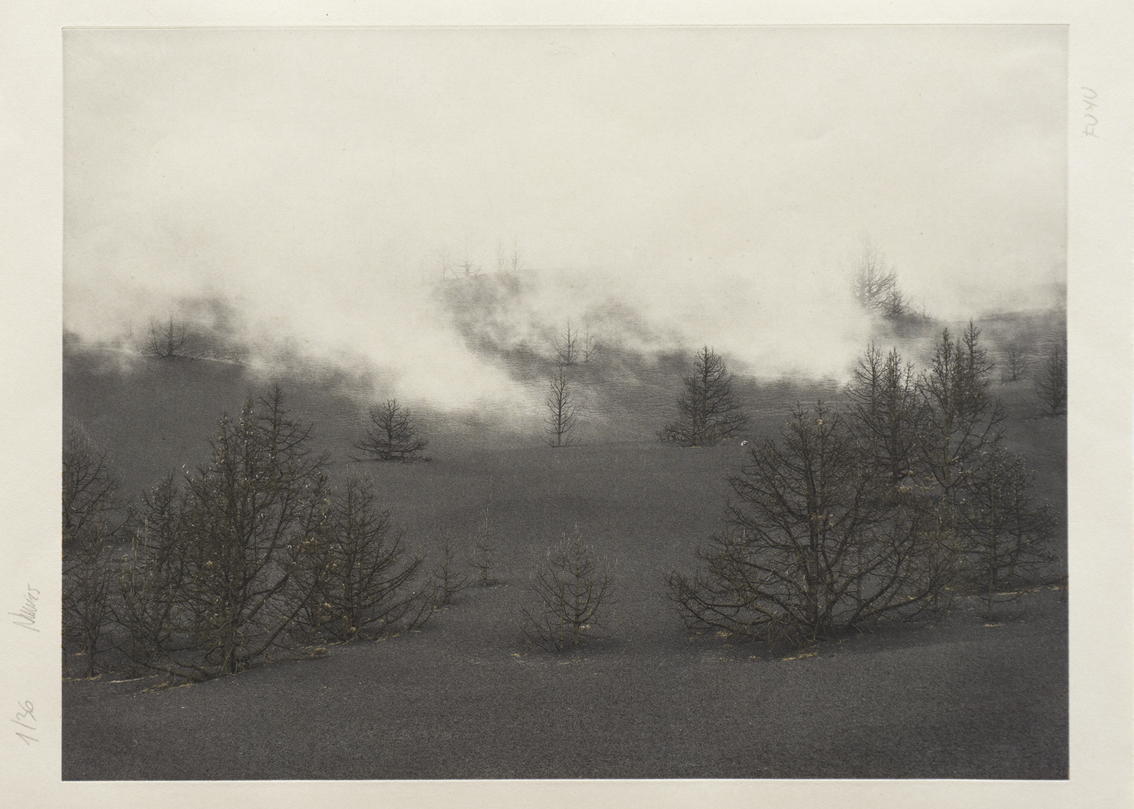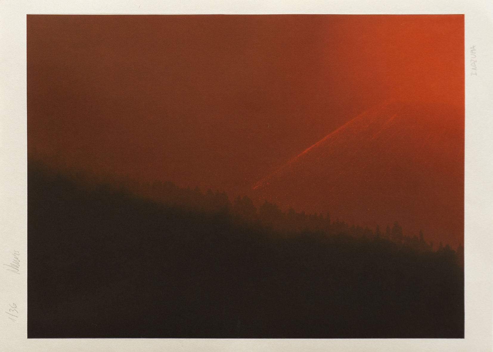 El hombre siempre ha buscado estar expuesto a lo sublime, porque solo en lo que no dominamos logramos estar en contacto real con nuestros límites. La naturaleza es ingobernable y muchas veces voraz. Quizá por eso, dentro de aquello que nos sobrecoge, existe una pulsión que nos hace mirar aún más lejos. ¿Puede contemplarse una tragedia que evidencia el latido mismo de la tierra? Inspirado en la serie de xilografías Treinta y seis vistas del Monte Fuji del maestro japonés Katsushika Hokusai (1760–1849), el fotógrafo Eduardo Nave emprendió un viaje para capturar la transforma- ción del paisaje de La Palma tras la erupción del volcán Tajogaite. Durante un año, regresó una y otra vez a la isla siguiendo el pulso cambiante de la tierra y su impacto en el territorio. De este proceso nace la suite In- Ázuma (Relámpago), una edición especial producida por Ogami Press. Cinco foto- grabados impresos sobre papel japonés que, al estilo de Hokusai, capturan la esencia de cada estación: primavera (Haru), verano (Natsu), otoño (Aki), invierno (Fuyu), junto a una imagen final que in- mortaliza el instante de la erupción.