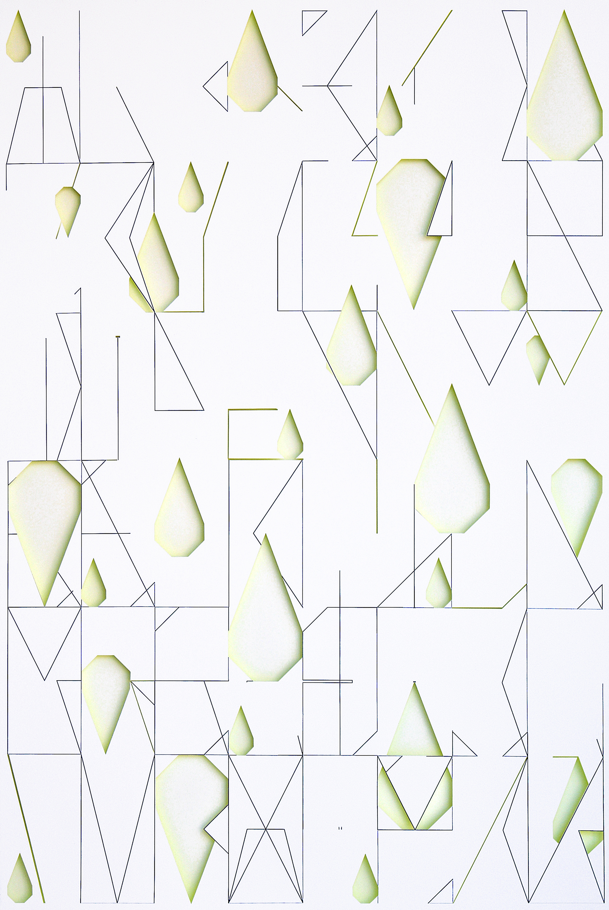 En esta pieza, Javier Pividal vuelve a desplegar su característico alfabeto críptico, ilegible pero sugerente, que más que comunicar, evoca. Junto a él, unas formas recortadas —similares a gotas, a fragmentos del cuerpo— abren huecos sobre la superficie, dejando filtrar un halo fluorescente. Ese resplandor, casi espectral, parece aludir a lo que Roland Barthes llamaría el "susurro del lenguaje": una presencia que no se impone, sino que se insinúa. La obra se mueve así entre lo visible y lo velado, lo corporal y lo simbólico, convocando una experiencia íntima y casi táctil del signo y su misterio.